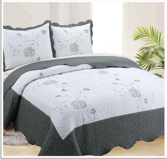 3 Piece Embroidered Quilt Set, Bedspread, Coverlet Set-White/Grey
