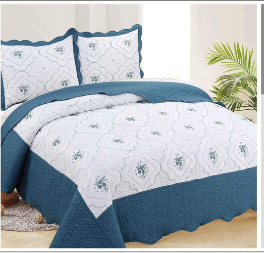 3 Piece Embroidered Quilt Set, Bedspread, Coverlet Set- White/Sky Blue